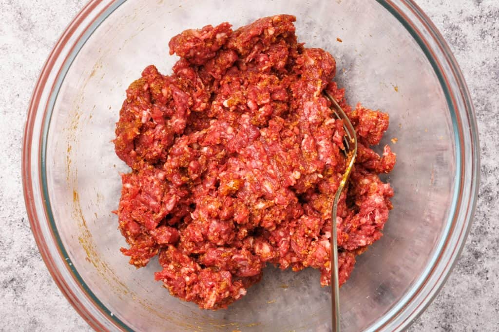 - Add the spices, gound beef, whisked egg, and breadcrumbs to a medium-sized bowl. Mix by hand or with a spoon to fully combine. Divide the mixture into 16 equally sized portions – just under golf-ball sized.1 lb ground beef, 1 egg, 1/4 cup breadcrumbs