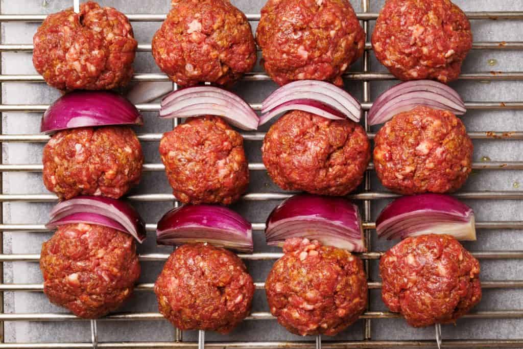 - In a small bowl, add the diced red onions, 1 tbsp of olive oil and salt. Toss to combine. Thread the meatballs and onions onto the skewers, alternating between the two.2 red onions, 1/4 tsp salt, 2 tbsp olive oil