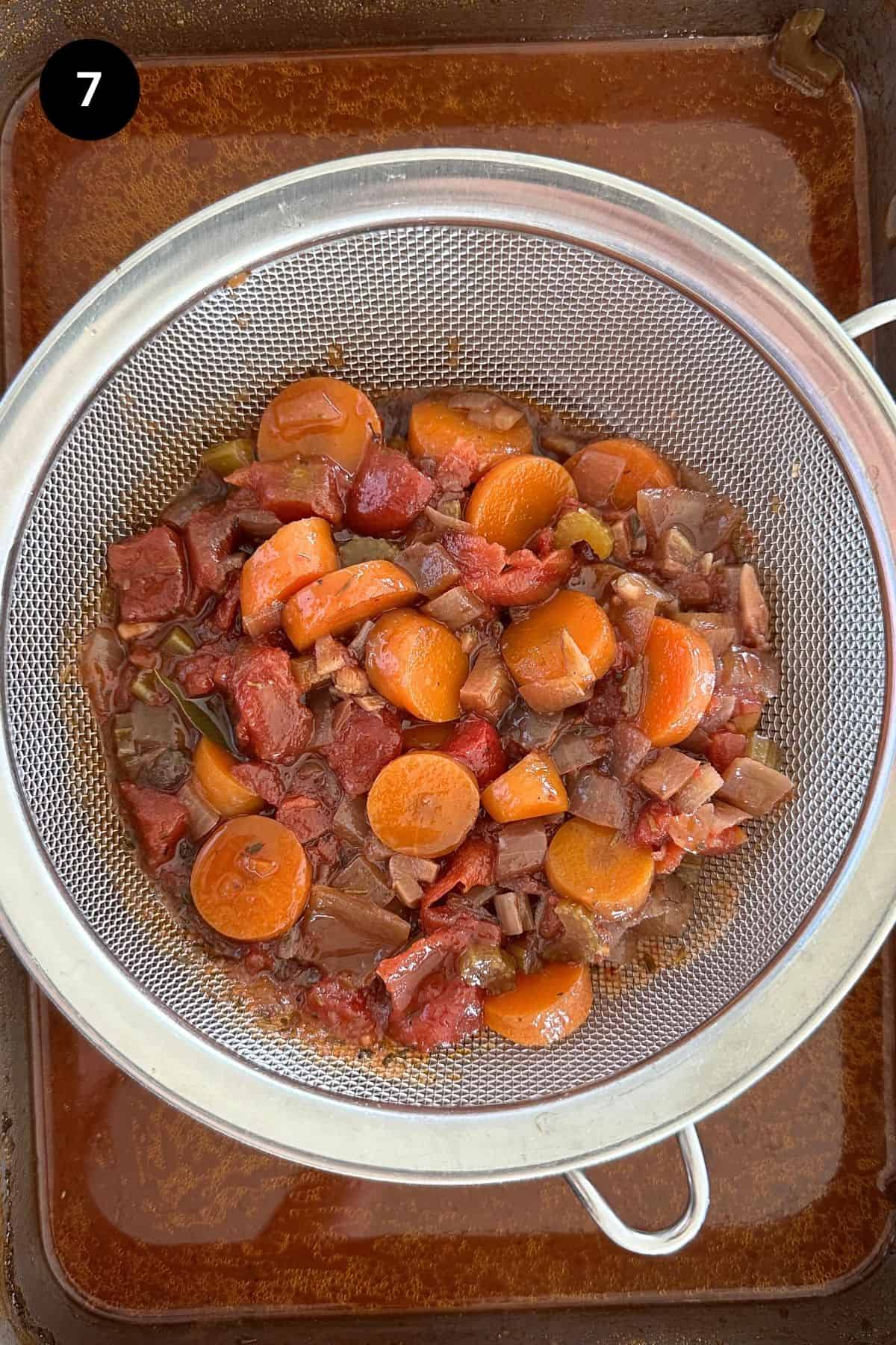 - Strain the sauce through a sieve into a large saucepan or pan (or keep the vegetables if you prefer a chunkier sauce but remove the bay leaf). Reduce the sauce by half on medium heat for 8-10 minutes. Season to taste with salt and ground black pepper.